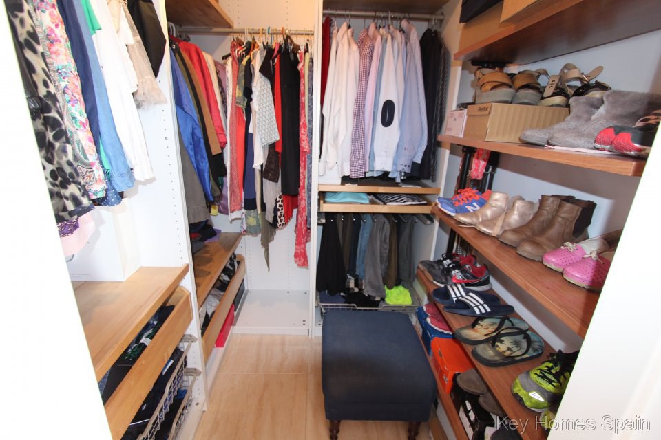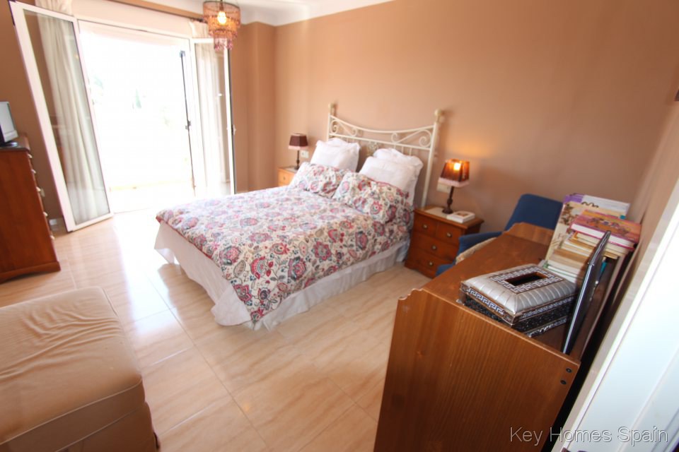 The master bedroom has a walk in wardrobe and large patio doors that open onto a beautiful terrace with stunning sea views.