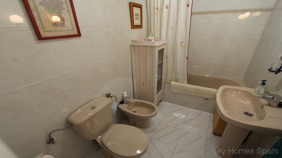 Stairs from the street entrance take you to the first floor where you will find a lounge-dining area with dual aspect patio doors with wooden shutters out onto Juliette balconies, A/C,  an american style kitchen and a shower room can also be found on this floor. Further stairs take you to the 3 bedrooms, all with A/C, sharing a full bathroom.  Upstairs there is a ulitity room and access out onto the large roof terrace.