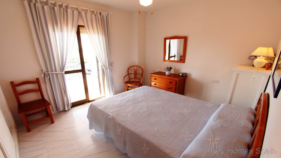 The master bedroom has a walk in wardrobe and large patio doors that open onto a beautiful terrace with stunning sea views.