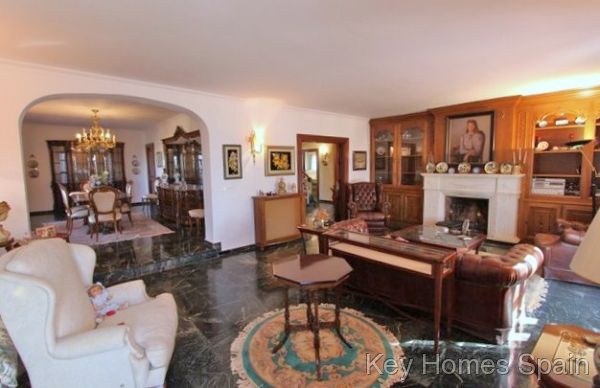 Treden leiden naar een grote hal, een kleine woonkamer met een serre, zeer grote woon / eetkamer met open haard, diverse deuren leiden naar de terrassen met uitzicht op de tuinen met uitzicht op de stad en de kust. Er is ook een douche , een grote aparte keuken en bijkeuken.